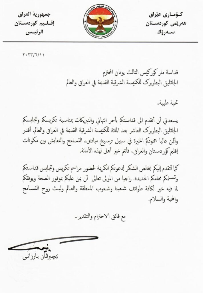 رسالة تهنئة من قبل فخامة رئيس اقليم كوردستان حضرة السيد نجيرفان بارزاني لقداسة ابينا البطريرك مار كوركيس الثالث يونان بمناسبة تكريسه وتجليسه جاثليقا بطريركا للكنيسة الشرقية القديمة في العراق والعالم.