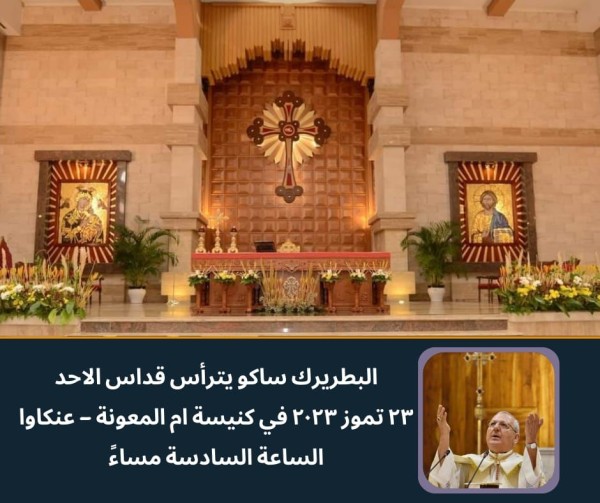 سيترأس القداس الإلهي يوم الأحد 23 تموز 2023 غبطة البطريرك لويس روفائيل ساكو في كنيسة أم المعونة – عنكاوا، بمرافقة المعاون البطريركي سيادة المطران باسيليوس يلدو، وسيادة المطران مار صبري انار المطران الجديد في تركيا، وذلك في الساعة السادسة مساءً، وسيتم نقل القداس مباشرة على صفحة البطريركية الكلدانية.
