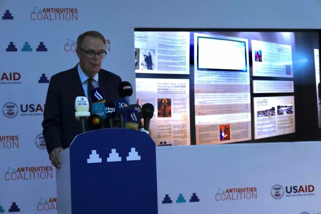 وأشار إلى الدور الرائد الذي لعبه المجتمع المسيحي في تاريخ العراق وفي المجتمع العراقيّ عمومًا، وفي إغناء التراث الدينيّ والثقافي للبلد وتنوّعه، وأضاف «إنه لمن دواعي سروري أن أنضمّ إليكم هنا اليوم، للاحتفال بمنحةٍ أخرى قدرها مليون دولار من تمويل الوكالة الأمريكية للتنمية الدولية USAID، للحفاظ على التراث الثقافي المتنوّع في العراق».