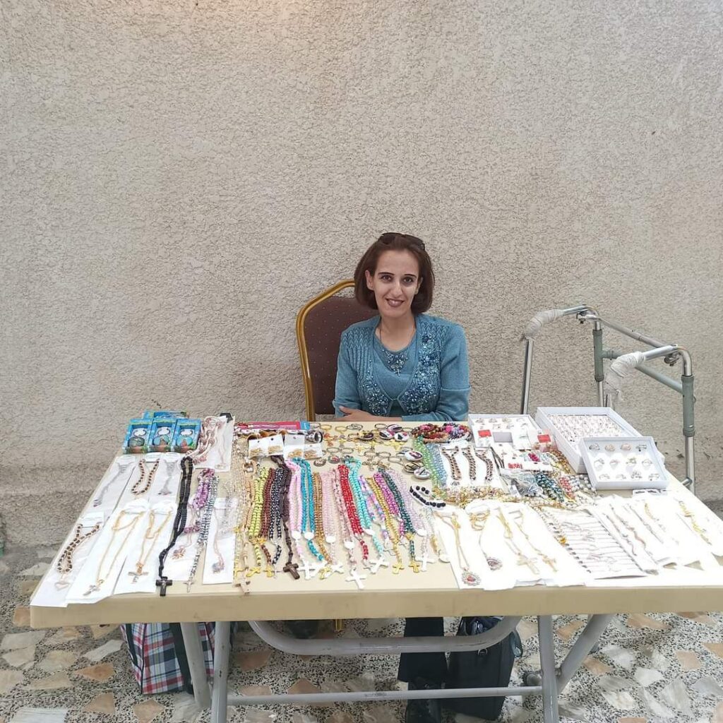اسمي صوفيا سعيد كامل، من بغداد، عمري 38 سنة. أرمنية الأصل، يتيمة الوالدين. أعمل في مجال الأعمال اليدوية، وبالرغم من صعوبة حالتي أعمل لكي أوفّر العلاج لإعاقتي.