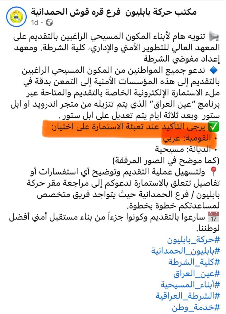 اطلعنا، بقلق على منشور لحركة بابليون على التواصل الاجتماعي يدعو فيه ابناء شعبنا الكلداني السرياني الآشوري و الأرمني ممن يرغب بالتقديم إلى المعهد العالي للتطوير الأمني والإداري التابع لكلية الشرطة ومعهد إعداد مفوضي الشرطة بملأ استمارة التقديم ، لكن ، شرط ان يُكتب في حقل القومية (عربي)!