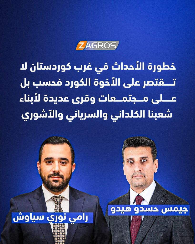 أعرب عضوا برلمان كوردستان جيمس حسدو هيدو ورامي نوري شياوش، اليوم الثلاثاء (26 كانون الثاني 2026)، عن قلقهما من الأحداث الجارية في وسوريا والخطر المحدق التي لا تقتصر على الكورد فحسب، بل على الكلدان و السريان والأشوريين.