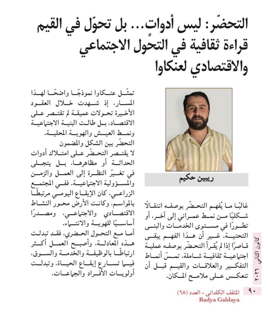 ومن هنا، فإن التفكير في مستقبل عنكاوا يتطلب مقاربة متوازنة، ترى في التحضّر فرصة للتجديد والبناء، شرط أن يُدار بوعي يحفظ الذاكرة الجماعية، ويصون القيم التي شكّلت روح المكان عبر تاريخه.